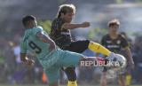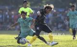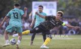 REPUBLIKA.CO.ID, TANGERANG -- Pesepak bola klub Liga 2 Persekat Tegal yang bermain untuk klub Sao Merah FC, Asri Akbar berebut bola dengan pesepak bola PSP Pasirandu dalam laga semifinal turnamen Kades Cup 1 Desa Legok, di lapangan Bonex Arena Tangerang, Banten, Kamis (9/3/2023). I