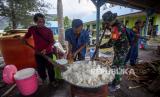 Anggota Babinsa Koramil 06/Serasan bersama warga memasak di dapur umum posko pengungsian di SMAN 1 Serasan, Kecamatan Serasan, Kabupaten Natuna, Kepulauan Riau, Jumat (10/3/2023). (FOTO : ANTARA FOTO/Teguh Prihatna )