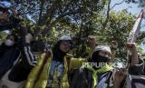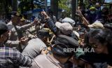 Massa yang tergabung dalam Aliansi Pecinta Alam Jawa Barat terlibat dorong-dorongan dengan aparat keamanan saat aksi di depan Kantor Perum Perhutani Divre Jabar dan Banten, Jalan Soekarno Hatta, Gedebage, Kota Bandung, Jawa Barat, Senin (13/3/2023). (FOTO : ABDAN SYAKURA/REPUBLIKA)