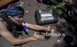 Seorang demonstran melakukan aksi teatrikal selamatkan Ranca Upas di depan Kantor Perum Perhutani Divre Jabar dan Banten, Jalan Soekarno Hatta, Gedebage, Kota Bandung, Jawa Barat, Senin (13/3/2023). (FOTO : ABDAN SYAKURA/REPUBLIKA)