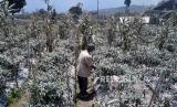 Warga membersihkan abu vulkanis pada tanaman cabai imbas erupsi Gunung Merapi di Desa Tlogolele, Selo, Boyolali, Jawa Tengah, Senin (13/3/2023). Salah satu desa terdekat dengan Gunung Merapi di arah Barat Daya mengalami hujan abu vulkanis cukup tebal. Hingga hari ke-tiga pasca erupsi besar pada Sabtu (11/3/2023) lalu, abu vulkanis tebal masih menutupi rumah warga dan perkebunan. Jarak Desa Tlogolele dari puncak Gunung Merapi sekitar lima kilometer, dan termasuk dalam kategori kawasan rawan bencana. (FOTO : Republika/Wihdan Hidayat)
