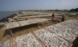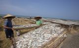 Pekerja menjemur ikan asin di desa Lombang, Juntinyuat, Indramayu, Jawa Barat, Senin (13/3/2023). Menurut pengusaha perikanan, produksi ikan asin jenis tanjan saat ini mengalami peningkatan hingga 60 persen sejak pasokan ikan dari nelayan mulai melimpah. (FOTO : Antara/Dedhez Anggara )