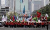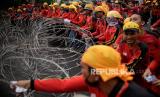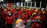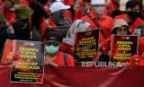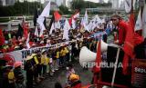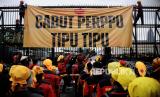 REPUBLIKA.CO.ID, SENAYAN -- Sejumlah massa aksi memasang spanduk saat unjuk rasa di depan Gedung DPR, Jakarta, Selasa (14/3/2023).