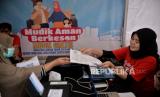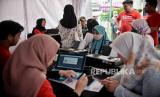 Petugas melayani calon pemudik saat melakukan registrasi pendaftaran mudik gratis di GOR Bulungan, Jakarta, Selasa (14/3/2023). (FOTO : Republika/Thoudy Badai)