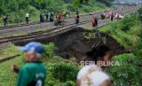 Warga melihat kondisi jalur rel kereta api Bogor-Sukabumi yang longsor di kawasan Empang, Kota Bogor, Jawa Barat, Rabu (15/3/2023). Longsor yang diakibatkan hujan deras tersebut membuat jalur kereta api KM 2+6/7 antara Stasiun Paledang dan Batu Tulis sehingga membuat seluruh perjalanan KA Pangrango lintas Bogor-Sukabumi harus dibatalkan. (FOTO : Republika/Putra M. Akbar)