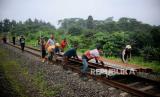 Pekerja membawa material untuk memperbaiki jalur rel kereta api Bogor-Sukabumi yang longsor di kawasan Empang, Kota Bogor, Jawa Barat, Rabu (15/3/2023). (FOTO : Republika/Putra M. Akbar)