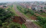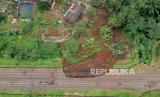 Foto udara jalur rel kereta api Bogor-Sukabumi yang longsor di kawasan Empang, Kota Bogor, Jawa Barat, Rabu (15/3/2023). Longsor yang diakibatkan hujan deras tersebut membuat jalur kereta api KM 2+6/7 antara Stasiun Paledang dan Batu Tulis sehingga membuat seluruh perjalanan KA Pangrango lintas Bogor-Sukabumi harus dibatalkan. (FOTO : Republika/Putra M. Akbar)