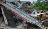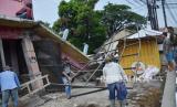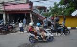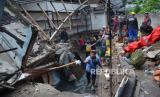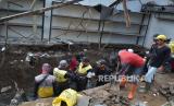 Petugas Dinas Sumber Daya Air dan Bina Marga (DSDABM) Kota Bandung, bersama waga berupaya mengangkat puing-puing sebuah bangunan yang ambruk di Jalan Cibolerang, Kecamatan Babakan Ciparay, Kota Bandung, Rabu (15/3/2023). (FOTO : Edi Yusuf/Republika)