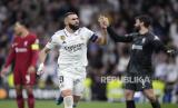 Pemain Real Madrid Karim Benzema melakukan selebrasi saat mencetak gol dalam Liga Champions, babak 16 besar, pertandingan sepak bola leg kedua antara Real Madrid dan Liverpool di stadion Santiago Bernabeu di Madrid, Spanyol, Kamis (16/3/2023). (FOTO : AP)
