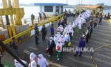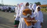 REPUBLIKA.CO.ID, SITUBONDO -- Santri antre menaiki Kapal Motor Penyeberangan (KMP) Munggiyango Hulalo di Pelabuhan Jangkar, Situbondo, Jawa Timur, Kamis (16/3/2023).