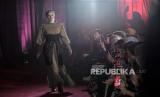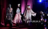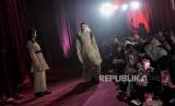 Model mengenakan busana karya kolaborasi desainer Barli Asmara dengan brand Aleza saat gelaran Aleza Raya Fashion Show di Jakarta, Kamis (16/3/2023). Menjelang Ramadhan dan Hari Raya, Aleza meluncurkan koleksi baru kolaborasi dengan desainer Indonesia Barli Asmara, Rama Dauhan dan Happa by Mel Ahyar dengan mengusung tema The Pandora dengan harapan menjadi tren busana yang bisa dinikmati kalangan pecinta fashion. (FOTO : Republika/Thoudy Badai)
