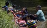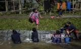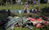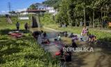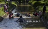 Sejumlah anak mencuci karpet masjid di Daerah Aliran Sungai (DAS) Ciwidey, Desa Sadu, Soreang, Kabupaten Bandung, Jawa Barat, Sabtu (18/3/2023). Gotong royong membersihkan karpet dan tikar masjid tersebut merupakan tradisi masyarakat yang diselenggarakan setiap sebulan menjelang bulan suci Ramadhan. (FOTO : ABDAN SYAKURA/REPUBLIKA)