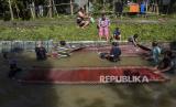 Sejumlah warga mencuci karpet masjid di Daerah Aliran Sungai (DAS) Ciwidey, Desa Sadu, Soreang, Kabupaten Bandung, Jawa Barat, Sabtu (18/3/2023). Gotong royong membersihkan karpet dan tikar masjid tersebut merupakan tradisi masyarakat yang diselenggarakan setiap sebulan menjelang bulan suci Ramadhan. (FOTO : ABDAN SYAKURA/REPUBLIKA)