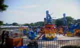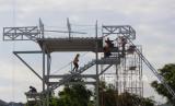 Pekerja mencoba salah satu wahana di Krakatau Park, kawasan Bakauheni Harbour City, Lampung, Sabtu (18/3/2023). Progres pembangunan Krakatau Park yang merupakan wisata lokal untuk mendorong percepatan pembukaan lapangan pekerjaan serta pertumbuhan ekonomi daerah tersebut telah mencapai 80 persen dan ditargetkan rampung pada Mei 2023. (FOTO : Republika/Putra M. Akbar)