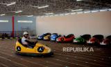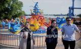 Jurnalis mencoba menaiki salah satu wahana pada Krakatau Park di kawasan Bakauheni Harbour City, Lampung, Sabtu (18/3/2023). Progres pembangunan Krakatau Park yang merupakan wisata lokal untuk mendorong percepatan pembukaan lapangan pekerjaan serta pertumbuhan ekonomi daerah tersebut telah mencapai 80 persen dan ditargetkan rampung pada Mei 2023. (FOTO : Republika/Putra M. Akbar)
