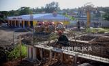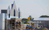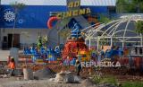 Pekerja beraktivitas pada area pembangunan Krakatau Park di kawasan Bakauheni Harbour City, Lampung, Sabtu (18/3/2023). Progres pembangunan Krakatau Park yang merupakan wisata lokal untuk mendorong percepatan pembukaan lapangan pekerjaan serta pertumbuhan ekonomi daerah tersebut telah mencapai 80 persen dan ditargetkan rampung pada Mei 2023. (FOTO : Republika/Putra M. Akbar)