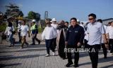 Menteri BUMN Erick Thohir bersama Direktur Utama Bunga Lampung Sejati Erwin Hidayat dan Wakil Gubernur Lampung Chusnunia Chalim saat meninjau pembangunan Krakatau Park di kawasan Bakauheni Harbour City, Lampung, Sabtu (18/3/2023). Progres pembangunan Krakatau Park yang merupakan wisata lokal untuk mendorong percepatan pembukaan lapangan pekerjaan serta pertumbuhan ekonomi daerah tersebut telah mencapai 80 persen dan ditargetkan rampung pada Mei 2023. (FOTO : Republika/Putra M. Akbar)