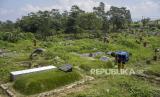 Petugas membersihkan makam di Tempat Pemakaman Umum (TPU) Cikadut, Mandalajati, Kota Bandung, Jawa Barat, Senin (20/3/2023). Menjelang bulan suci Ramadhan, TPU Covid-19 Cikadut ramai dikunjungi peziarah yang datang untuk mendoakan keluarga serta kerabat yang telah wafat. (FOTO : ABDAN SYAKURA/REPUBLIKA)