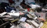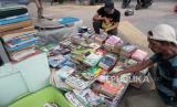 Pedagang buku bekas menggelar barang dagangannya di Pasar Loak Kebayoran Lama, Jakarta, Selasa (21/3/2023). (FOTO : Republika/Prayogi.)