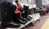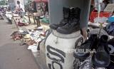Pedagang sepatu bekas menggelar barang dagangannya di Pasar Loak Kebayoran Lama, Jakarta, Selasa (21/3/2023). Barang yang dijual di tempat itu mulai dari berbagai aksesoris, sepatu, dompet, jam, gitar, kamera, helm, baju, kipas angin, handphone, peralatan dapur, kaset, pajangan, hingga barang-barang antik. (FOTO : Republika/Prayogi.)