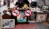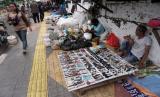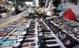Pedagang barang bekas menggelar barang dagangannya di Pasar Loak Kebayoran Lama, Jakarta, Selasa (21/3/2023). Pasar barang bekas atau pasar loak tersebut menjual berbagai barang bekas yang beragam, mulai dari berbagai aksesoris, sepatu, dompet, jam, gitar, kamera, helm, baju, kipas angin, handphone, peralatan dapur, kaset, pajangan, hingga barang-barang antik. Pasar Loak yang terletak di samping stasiun Kebayoran ini Keberadaannya tidak jarang menarik perhatian penumpang kereta, masyarakat setempat, ataupun orang yang sudah mengetahui keberadaan pasar loak tersebut. (FOTO : Republika/Prayogi.)
