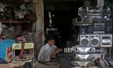 Pedagang radio lawas menggelar dagangannya di Pasar Loak Kebayoran Lama, Jakarta, Selasa (21/3/2023). (FOTO : Republika/Prayogi.)
