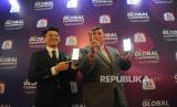 CEO JomBingo Martin W. James (kanan) didampingi Marketing Director Billy Kai (kiri) menunjukkan platform belanja daring JomBingo saat peluncuran fitur Jombingo Mall Jakarta, Ahad (26/3/2023).  (FOTO : Tahta Aidilla/Republika)