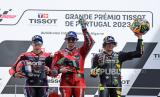 Pembalap MotoGP Italia Francesco Bagnaia (Tengah) dari Tim Ducati Lenovo, Pembalap MotoGP Spanyol Maverick Vinales (Kiri) dari Aprilia Racing dan Pembalap MotoGP Italia Marco Bezzecchi dari Tim Balap Mooney VR46 merayakan kemenangan di podium setelah balapan MotoGP di Motorcycling Grand Prix of Portugal di trek balap Algarve International, Portimao, Portugal, Ahad, (26/3/2023). (FOTO : LUSA)