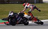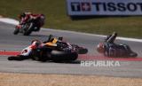 REPUBLIKA.CO.ID, PORTIMAO -- Rangkaian kejadian saat Marc Marquez dari Repsol Honda Team (kiri) dan CryptoDATA RNF MotoGP Team Miguel Oliveira saat mengalami kecelakaan dalam balapan MotoGP di Grand Prix Sepeda Motor Portugal di trek balap Algarve International, Portimao, Portugal, Ahad, (26/3/2023).