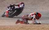 Pembalap tim Repsol Honda Marc Marquez terjatuh setelah mengalami kecelakaan saat balapan di Grand Prix Sepeda Motor Portugal di trek balap Algarve International, Portimao, Portugal, Ahad, (26/3/2023). (FOTO : REUTERS/Marcelo Del Pozo)