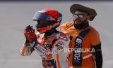Pembalap tim Repsol Honda Marc Marquez meminta maaf setelah terjatuh saat balapan di Grand Prix Sepeda Motor Portugal di trek balap Algarve International, Portimao, Portugal, Ahad, (26/3/2023). (FOTO : REUTERS/Marcelo Del Pozo)