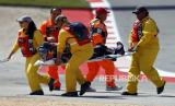 Pembalap Tim MotoGP CryptoDATA RNF Miguel Oliveira dikeluarkan dari lintasan dengan tandu setelah mengalami kecelakaan saat balapan di Grand Prix Sepeda Motor Portugal di trek balap Algarve International, Portimao, Portugal, Ahad, (26/3/2023). (FOTO : REUTERS/Marcelo Del Pozo)