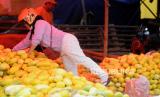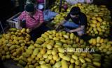 Pedagang menyortir buah Timun Suri di Pasar Induk Kramat Jati, Jakarta, Senin (27/3/2023). (FOTO : Republika/Putra M. Akbar)