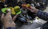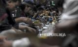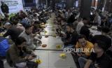 Umat muslim menyantap makanan saat berbuka puasa di Masjid Al Lathiif, Jalan Saninten, Cihapit, Kota Bandung, Jawa Barat, Senin (27/3/2023). Selama Bulan Suci Ramadhan, DKM Al Lathiif menyediakan 400-500 paket takjil per hari berupa makanan dan minuman bagi warga yang akan berbuka puasa di Masjid Al Lathiif. (FOTO : ABDAN SYAKURA/REPUBLIKA)