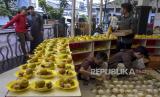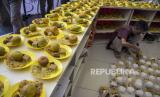 Pengurus DKM Al Lathiif menyiapkan makanan (takjil) untuk dibagikan ke warga di Masjid Al Lathiif, Jalan Saninten, Cihapit, Kota Bandung, Jawa Barat, Senin (27/3/2023). Selama Bulan Suci Ramadhan, DKM Al Lathiif menyediakan 400-500 paket takjil per hari berupa makanan dan minuman bagi warga yang akan berbuka puasa di Masjid Al Lathiif. (FOTO : ABDAN SYAKURA/REPUBLIKA)