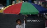 Seorang anak berteduh dibawah payung saat hujan di kawasan Banjir Kanal Timur, Duren Sawit, Jakarta, Senin (27/3/2023). Badan Meteorologi Klimatologi dan Geofisika memprakirakan hujan masih berpotensi terjadi hingga awal April 2023 mendatang yang disebabkan dinamika atmosfer masih mengalami peralihan dari musim penghujan menuju musim kemarau. (FOTO : Republika/Putra M. Akbar)