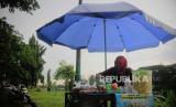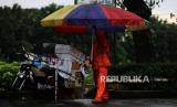 Pedagang menggunakan payung untuk melindungi barang dagangannya di kawasan Banjir Kanal Timur, Duren Sawit, Jakarta, Senin (27/3/2023). Badan Meteorologi Klimatologi dan Geofisika memprakirakan hujan masih berpotensi terjadi hingga awal April 2023 mendatang yang disebabkan dinamika atmosfer masih mengalami peralihan dari musim penghujan menuju musim kemarau. (FOTO : Republika/Putra M. Akbar)