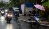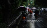 Pengendara motor melintas menggunakan payung di Jalan Kolonel Sugiono, Duren Sawit, Jakarta, Senin (27/3/2023). Badan Meteorologi Klimatologi dan Geofisika memprakirakan hujan masih berpotensi terjadi hingga awal April 2023 mendatang yang disebabkan dinamika atmosfer masih mengalami peralihan dari musim penghujan menuju musim kemarau. (FOTO : Republika/Putra M. Akbar)