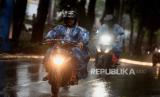 Pengendara motor melintas menggunakan jas hujan di Jalan Kolonel Sugiono, Duren Sawit, Jakarta, Senin (27/3/2023). Badan Meteorologi Klimatologi dan Geofisika memprakirakan hujan masih berpotensi terjadi hingga awal April 2023 mendatang yang disebabkan dinamika atmosfer masih mengalami peralihan dari musim penghujan menuju musim kemarau. (FOTO : Republika/Putra M. Akbar)