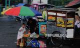 Pedagang takjil menggunakan payung untuk melindungi barang dagangannya dari hujan di kawasan Banjir Kanal Timur, Duren Sawit, Jakarta, Senin (27/3/2023). Badan Meteorologi Klimatologi dan Geofisika memprakirakan hujan masih berpotensi terjadi hingga awal April 2023 mendatang yang disebabkan dinamika atmosfer masih mengalami peralihan dari musim penghujan menuju musim kemarau. (FOTO : Republika/Putra M. Akbar)