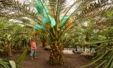 Pekerja merawat pohon kurma di Desa Kutambaru, Tiganderket, Karo, Sumatera Utara, Senin (27/3/2023). Kebun kurma yang berada di ketinggian 750 meter di atas permukaan laut (mdpl) dan memiliki luas 1,8 hektar tersebut ditanami 200 batang pohon kurma yang terdiri dari 165 batang pohon kurma betina dan 35 batang pohon kurma jantan. (FOTO : Antara/Fransisco Carolio )