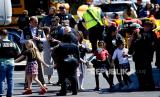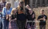 Anak-anak dan seorang wanita meninggalkan pusat reunifikasi setelah penembakan di sekolah Covenant, Nashville, Tennessee, AS, Senin (27/3/2023). (FOTO : AP Photo/John Bazemore)