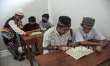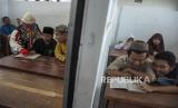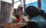 Anggota Badut Nyentrik Cimahi Bandung Sauyunan (Necis) mengetes siswa penyandang disabilitas huruf hijaiah saat Safari Ramadhan di SLB BC Bina Widya, Batujajar, Kabupaten Bandung Barat, Jawa Barat, Selasa (28/3/2023). Pihak SLB BC Bina Widya bersama Badut Necis menggelar Safari Ramadhan yang merupakan bagian dari kegiatan Milenial SmartTren Ramadhan. Kegiatan tersebut bertujuan untuk mengisi waktu luang siswa di Bulan Suci Ramadhan dengan kegiatan positif seperti permainan sensorik dan motorik, mendengar tausiyah, hafalan doa serta membaca Iqro. (FOTO : ABDAN SYAKURA/REPUBLIKA)
