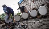 REPUBLIKA.CO.ID,GRESIK -- Perajin mengeringkan rebana dengan bara api di sentra kerajinan rebana, Desa Bungah, Gresik, Jawa Timur (28/3/2023).
