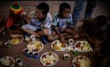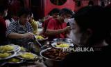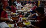 Warga menyantap makanan saat buka puasa di Vihara Dharma Bakti, Glodok, Jakarta, Selasa (28/3/2023). Sebanyak 250 porsi makanan disediakan oleh pengurus Vihara Dharma Bakti untuk berbuka puasa bagi warga sekitar sebagai ajang mempererat persaudaraan umat beragama pada bulan Ramadan. (FOTO : Republika/Putra M. Akbar)