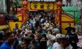 Warga mengantre untuk mengambil makanan buka puasa di Vihara Dharma Bakti, Glodok, Jakarta, Selasa (28/3/2023). Sebanyak 250 porsi makanan disediakan oleh pengurus Vihara Dharma Bakti untuk berbuka puasa bagi warga sekitar sebagai ajang mempererat persaudaraan umat beragama pada bulan Ramadan. (FOTO : Republika/Putra M. Akbar)