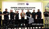 Presiden Direktur Maybank Indonesia Taswin Zakaria (keempat kanan) didampingi Sekjen PB PASI Tigor Tanjung (keempat kiri), Race Director Maybank Marathon 2023 Widya Permana (ketiga kanan) dan jajaran direksi Maybank Indonesia mengibarkan bendera start dalam konferensi pers Maybank Marathon 2023 di Jakarta, Rabu (29/3/2023). Maybank Indonesia mengumumkan penyelenggaraan ajang World Athletics? Elite Label Road Race Maybank Marathon 2023 yang akan dilaksanakan di Bali Safari & Marine Park Gianyar pada 27 Agustus 2023 dengan memperlombakan kategori marathon (42,195 km), half-marathon (21,1 km) dan 10K, serta Children Sprint dengan total hadiah lebih dari Rp2,7 miliar. (FOTO : Dok Republika)