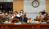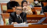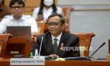 Ketua Komite Koordinasi Nasional Pencegahan dan Pemberantasan Tindak Pidana Pencucian Uang (Komite TPPU) Sekaligus Menko Polhukam Mahfud MD saat mengikuti Rapat Dengar Pendapat Umum (RDPU) dengan Komisi III DPR di Kompleks Perlemen, Senayan, Jakarta, Rabu (29/3/2023). Rapat tersebut membahas transaksi mencurigakan di Kementerian Keuangan yang bernilai Rp 349 triliun. (FOTO : Republika/Prayogi.)