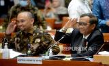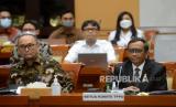 Ketua Komite Koordinasi Nasional Pencegahan dan Pemberantasan Tindak Pidana Pencucian Uang (Komite TPPU) Sekaligus Menko Polhukam Mahfud MD dan Kepala Pusat Pelaporan dan Analisis Transaksi Keuangan (PPATK) Ivan Yustiavandana saat mengikuti Rapat Dengar Pendapat Umum (RDPU) dengan Komisi III DPR di Kompleks Perlemen, Senayan, Jakarta, Rabu (29/3/2023). Rapat tersebut membahas transaksi mencurigakan di Kementerian Keuangan yang bernilai Rp 349 triliun. (FOTO : Republika/Prayogi.)
