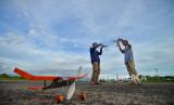 Komunitas Pesawat Tenaga Karet (Rubber Powered Aeromodelling) Sarupoae memainkan pesawat mereka sambil Ngabuburit di Lanud Sutan Sjahrir Padang, Sumatera Barat, Rabu (29/3/2023). Komunitas yang baru didirikan dan memainkan salah satu cabang dalam aero sport tersebut rutin menggelar latihan terbang di bawah binaan Lanud Sutan Sjahrir Padang Federasi Aerosport Indonesia (FASI) Padang. (FOTO : Antara/Iggoy el Fitra )
